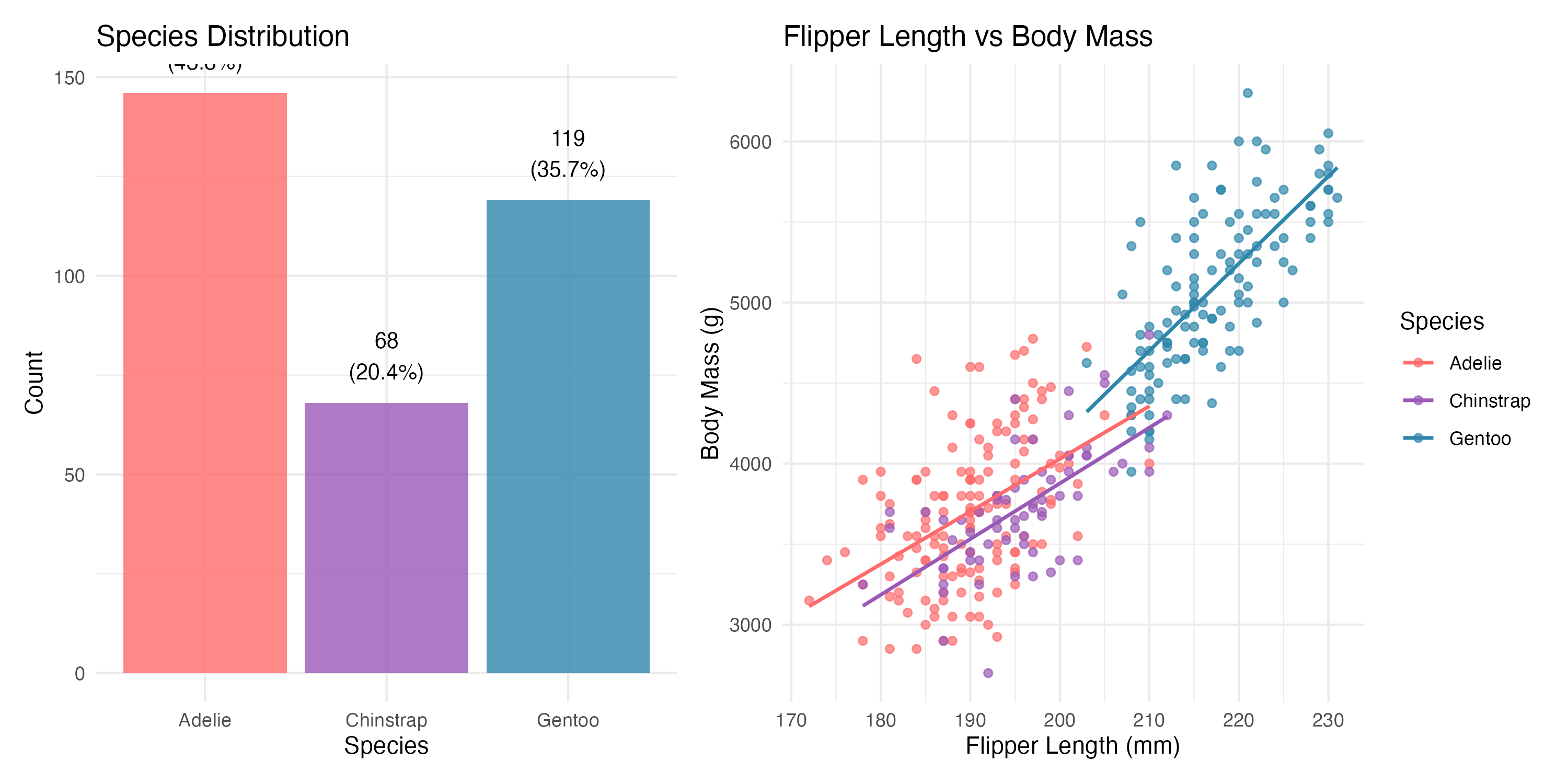 penguin_colors <- c("Adelie" = "#FF6B6B", "Chinstrap" = "#9B59B6", "Gentoo" = "#2E86AB")3 Meet the Penguins: Dataset Overview