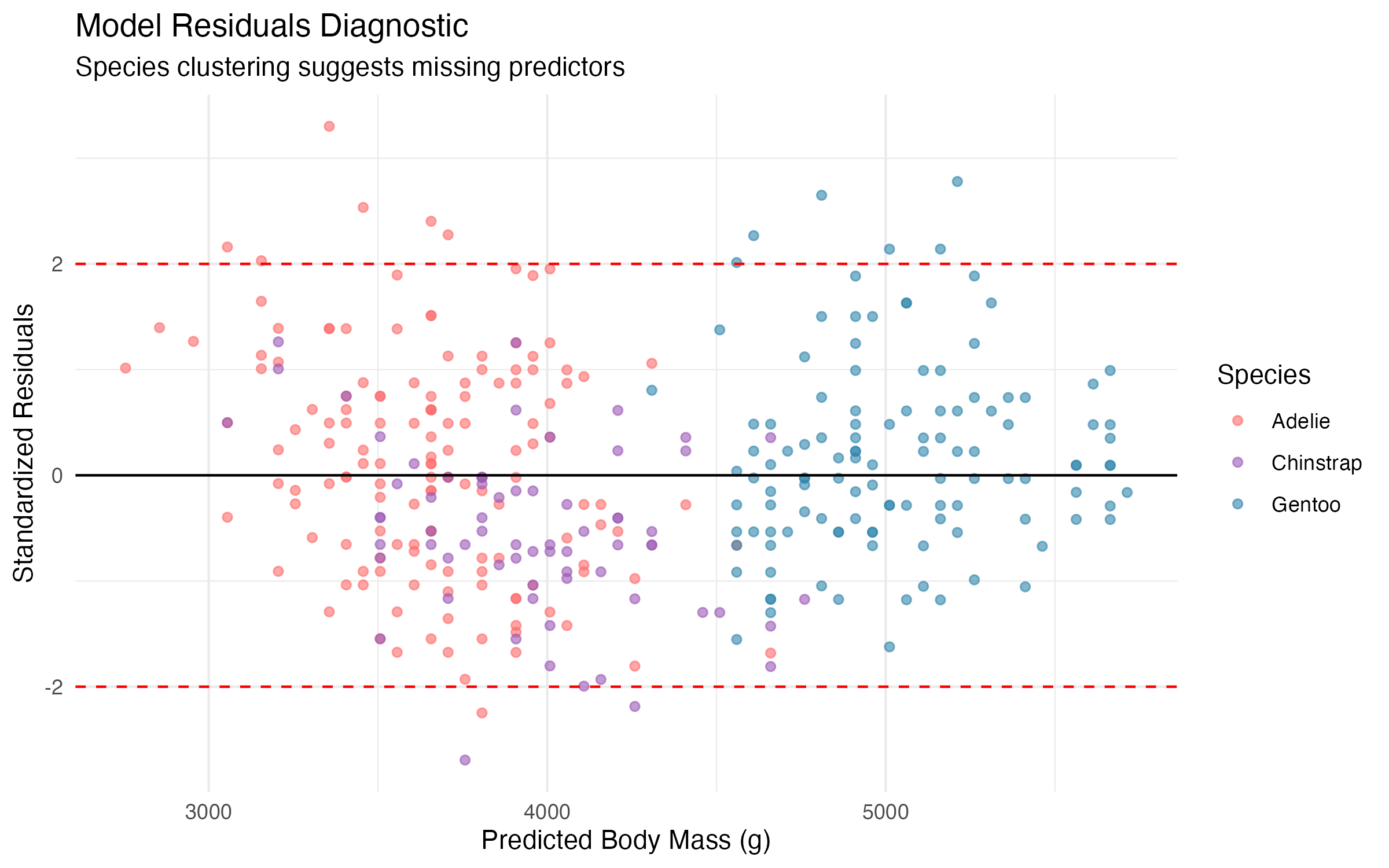 Species-Specific Patterns: Residual clustering by species suggests important biological differences not captured by flipper length alone