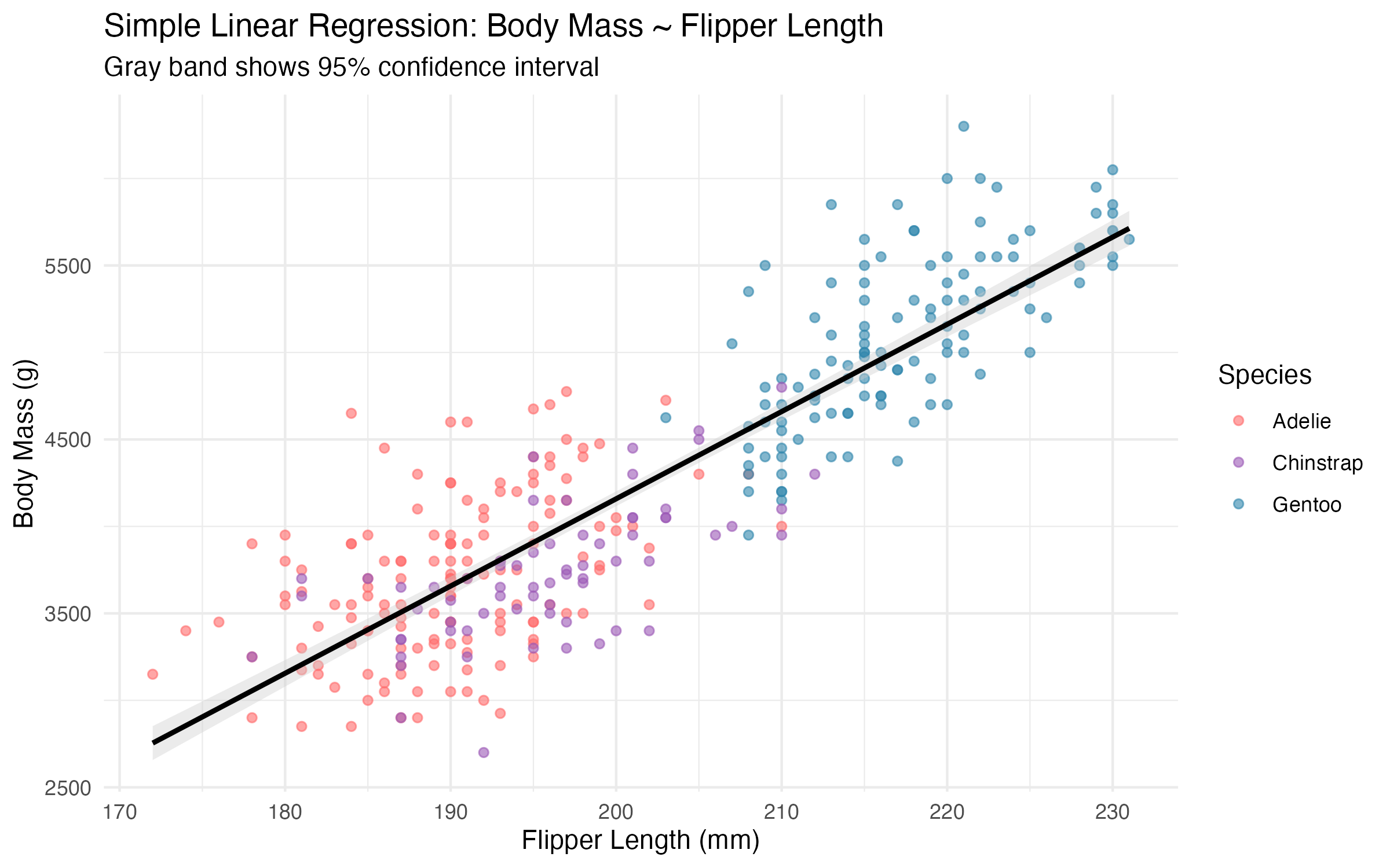 | Flipper Length (mm) | Predicted Body Mass (g) | 95% CI Lower | 95% CI Upper |