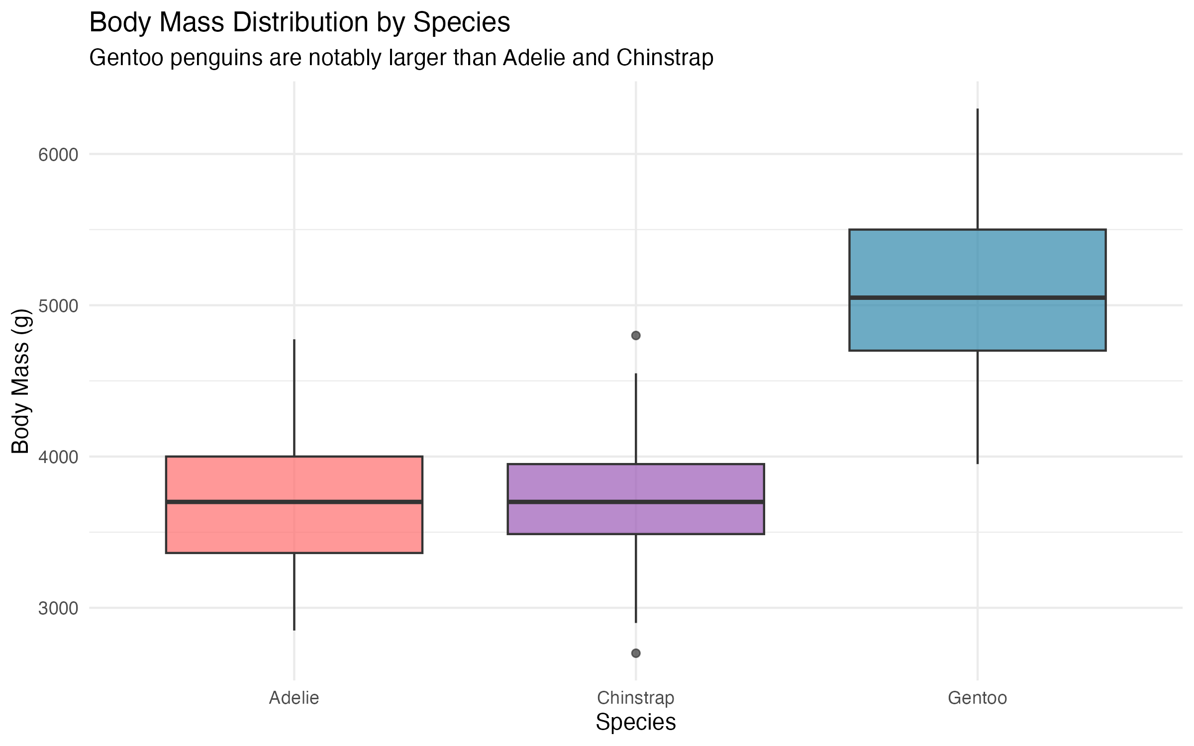 By the end of this post, you’ll have a solid understanding of the data structure and the strongest individual predictors of penguin body mass.